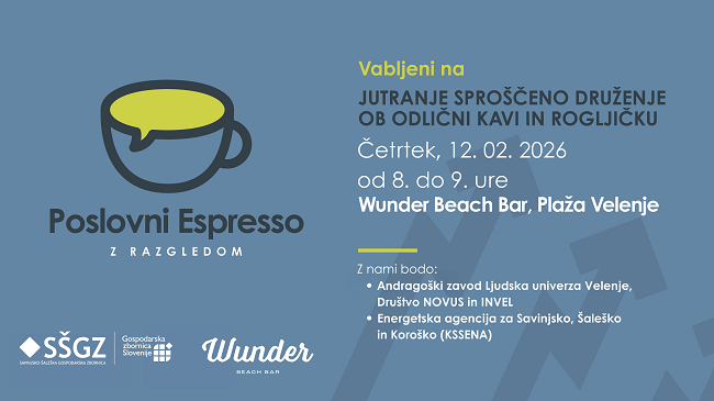 Vabljeni na februarski Poslovni Espresso Savinjsko-šaleške gospodarske zbornice, kjer bomo v duhu novega leta odpirali vrata novim priložnostim, projektom in sodelovanjem v SAŠA regiji. Dogodek bo namenjen predstavitvi aktualnih projektov, hkrati pa tudi izmenjavi pogledov o izzivih in priložnostih na področju izobraževanja, razvoja kadrov in kariernih prehodov v Savinjski regiji.