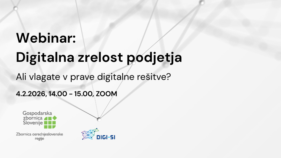 Z namenom, da podjetjem ponudimo boljše razumevanje digitalne zrelosti in širšega konteksta digitalizacije gospodarstva, pripravljamo brezplačni informativni webinar, namenjen podjetjem osrednjeslovenske regije.