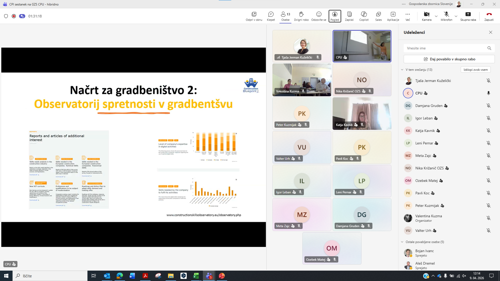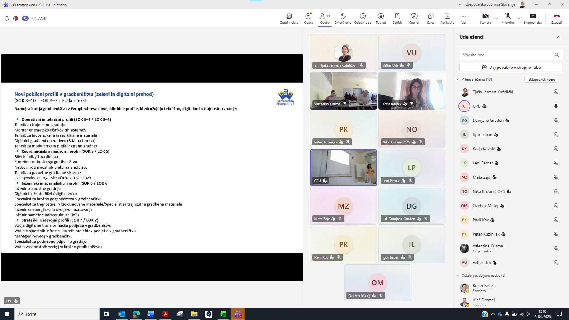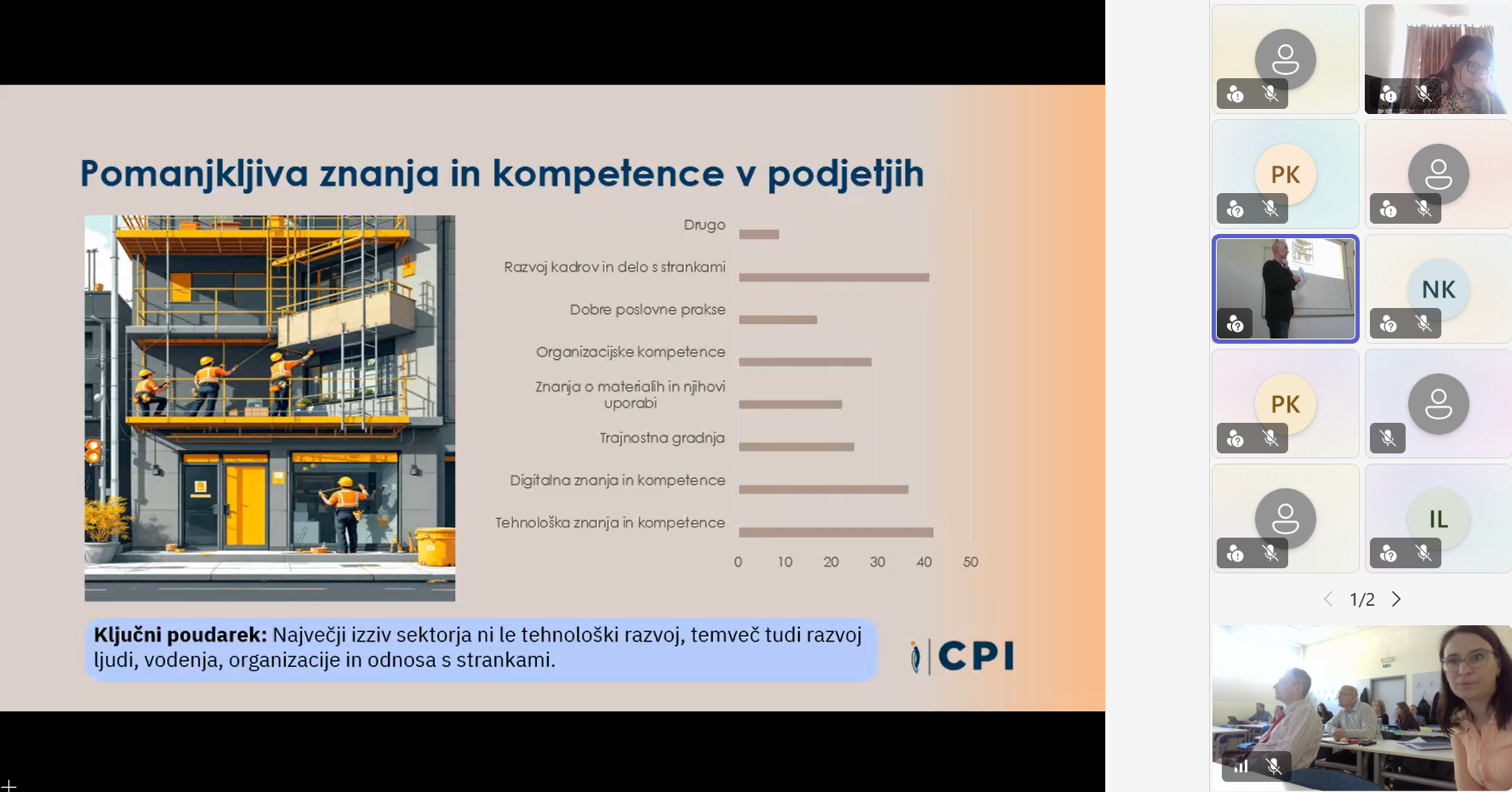 Ljubljana, 9. april 2026 – Na GZS – Zbornici gradbeništva in industrije gradbenega materiala (ZGIGM) je danes potekalo strokovno srečanje deležnikov s področja gradbeništva, izobraževanja in oblikovanja politik, namenjeno razpravi o prihodnjih potrebah po znanjih, kompetencah in kadrih v gradbenem sektorju. Dogodek, ki je potekal v hibridni obliki, smo organizirali v sodelovanju s Centrom RS za poklicno izobraževanje (CPI RS) in Obrtno-podjetniško zbornico Slovenije (OZS). Srečanje je bilo tesno povezano z aktualno nacionalno prenovo poklicnih standardov, ki predstavljajo temelj za izobraževalne programe in sistem nacionalnih poklicnih kvalifikacij. CPI RS je predstavil inovativen pristop k analizi stanja v sektorju, ki temelji na kombinaciji več metod – od anketiranja podjetij (124 sodelujočih), intervjujev z vsemi relevantnimi gradbenimi šolami, analize podatkov Zavoda RS za zaposlovanje, do spremljanja zaposlitvenih oglasov in delavnic s strokovnjaki. Tak celosten pristop omogoča bistveno boljše razumevanje dejanskih potreb trga dela. Predstavljeni ekonomski kazalniki potrjujejo, da gradbeništvo ostaja eden ključnih stebrov slovenskega gospodarstva, vendar se hkrati sooča z izrazitimi izzivi. Med njimi izstopajo pomanjkanje ustreznih kadrov, vse večja kompleksnost projektov ter naraščajoči pritiski na stroške in roke izvedbe. Analiza je dodatno pokazala pomemben razkorak med znanji, ki jih ponuja izobraževalni sistem, in kompetencami, ki jih podjetja dejansko potrebujejo – zlasti na področju digitalnih znanj, razumevanja procesov, osnovnih tehničnih znanj ter mehkih veščin. Pomemben del razprave je bil namenjen tudi evropskim trendom in zelenemu prehodu, kjer je bilo poudarjeno, da trajnost postaja temeljni princip razvoja gradbeništva in ne več zgolj dodatna vsebina. V tem kontekstu imajo ključno vlogo izobraževalne institucije, ki morajo prihodnje kadre pripraviti na delo v vse bolj kompleksnem in hitro spreminjajočem se okolju. Na dogodku smo predstavili tudi projekt Construction Blueprint 2 (CB2), ki v okviru evropskega Pakta za spretnosti razvija nove pristope k izobraževanju v gradbeništvu. V ospredju so t. i. mikrokompetence – kratki, ciljno usmerjeni programi usposabljanja, ki odgovarjajo na konkretne potrebe trga dela. Slovenski pilot, ki ga razvijamo na GZS ZGIGM, se osredotoča na mikrokompetenco »Reagiranje na dogodke v časovno kritičnih okoljih«, ki krepi sposobnosti odločanja pod pritiskom, organizacijskega odzivanja ter učinkovitega usklajevanja v zahtevnih situacijah na gradbišču. Hkrati projekt CB2 naslavlja tudi razvoj novih, nastajajočih poklicnih profilov v gradbeništvu, ki združujejo tehnična, digitalna in organizacijska znanja. Takšni profili bodo ključni za uspešno izvajanje projektov v prihodnje, zlasti v kontekstu digitalizacije, trajnosti in večje nepredvidljivosti okolja. Srečanje se je zaključilo z razpravo, ki je potrdila velik interes deležnikov za nadaljnje sodelovanje in razvoj novih pristopov. Pred nami je še veliko dela, zato na GZS ZGIGM vabimo vse izobraževalne institucije, podjetja in strokovnjake k aktivnemu sodelovanju pri pilotiranju mikrokompetenc ter vključevanju v evropski Pakt za spretnosti. Le z izmenjavo dobrih praks, inovativnih pristopov in konkretnih izkušenj bomo lahko skupaj oblikovali sodoben, odporen in konkurenčen gradbeni sektor prihodnosti.