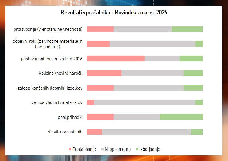 Marec prinaša nekoliko bolj razgibano sliko kot februar, z več znaki stabilizacije na eni strani, a tudi z izrazitejšimi poslabšanji razpoloženja na drugi. Kovindeks se je zvišal iz 45,0 na 49,1 točke, kar kaže na zmanjšanje intenzivnosti krčenja, vendar se sektor še vedno nahaja pod mejo rasti. To pomeni, da se stanje sicer ne poslabšuje več, a še vedno ne kaže jasnega preobrata. Dolgoročno ostaja kazalnik na 3-mesečnem dnu, kar potrjuje, da industrija še ni prestopila v fazo okrevanja.